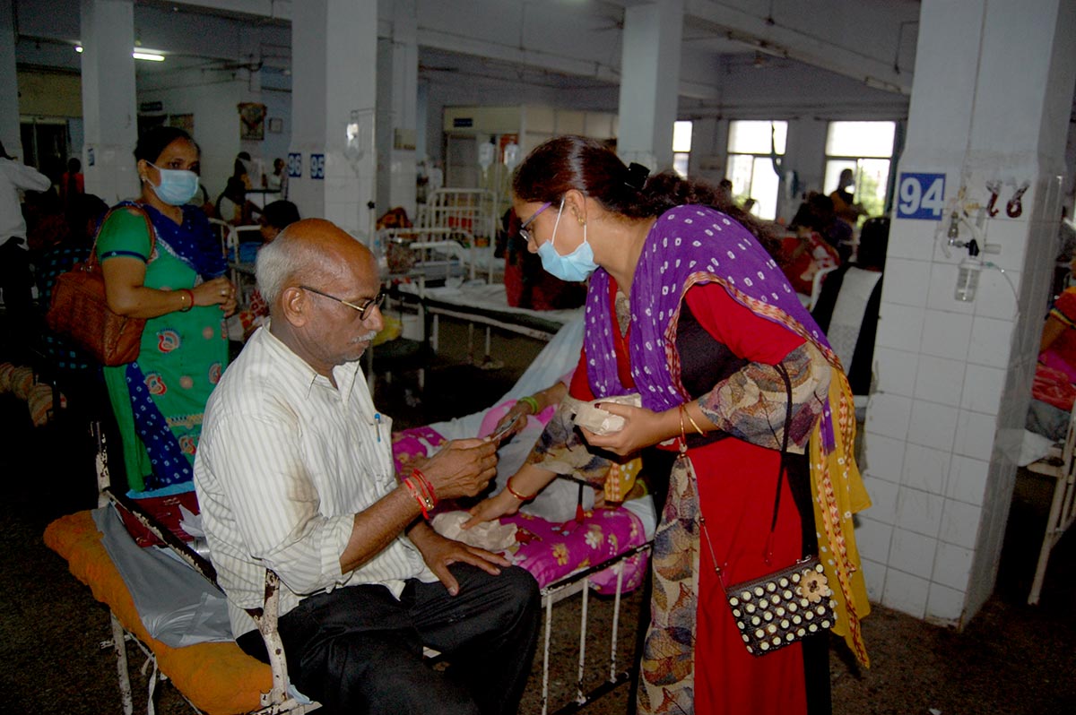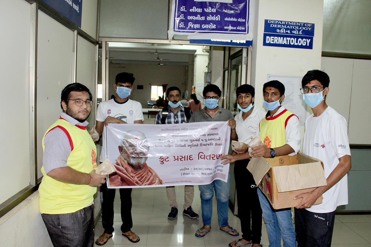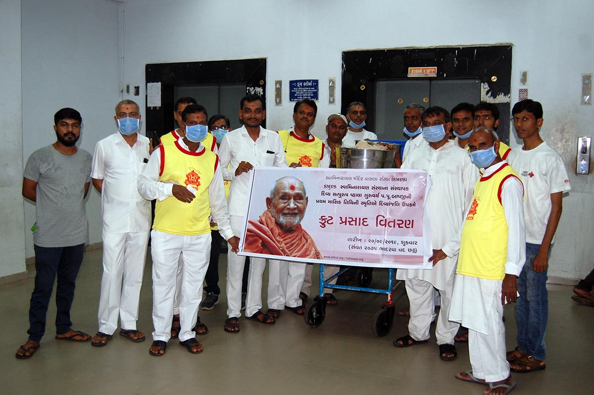 SMVS સ્વામિનારાયણ સંસ્થાના સંસ્થાપક ગુરુવર્ય પ.પૂ.બાપજીની પ્રથમ માસિક તિથીની મૃતિએ દિવ્યાંજલિ ઉપક્રમે તા.૨૦/૦૯/ર૦૧૯ના રોજ પપૂ.સ્વામીશ્રીની આજ્ઞાથી SMVSના ૫૦૦ જેટલા પુરુષ-મહિલા કાર્યકરો દ્વારા સિવિલ હોસ્પિટલ, સોલા હોસ્પિટલ, સિવિલ હોસ્પિટલ-ગાંધીનગર, શારદાબેન હોસ્પિટલ, V S હોસ્પિટલ, L G હોસ્પિટલ, GCS હોસ્પિટલ, જીવરાજ મહેતા હોસ્પિટલ જેવી અમદાવાદ-ગાંધીનગરની ૧૦ થી વધુ જનરલ હોસ્પિટલમાં ૬૦૦૦ થી વધુ દર્દીઓ તથા ઘરડાઘરના વડીલોને ર૦૦૦ કિલો તાજા સફરજનનું વિતરણ કરવામાં આવ્યું. દર્દીઓ જલ્દીથી સ્વસ્થ થાય અને દીર્ધાયુ પ્રાપ્ત કરે તે માટે પ.પૂ.સ્વામીશ્રીએ ભગવાન સ્વામિનારાયણ તથા પ.પૂ.બાપજીના દિવ્ય ચરણોમાં પ્રાર્થના સહ આશીર્વાદ પાઠવ્યા છે.